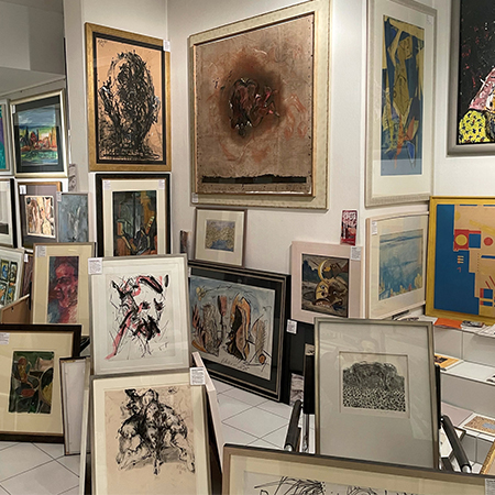 Der Kunsthandel eignet sich hervorragend zum Stöbern und lädt zum Verweilen ein. In Petersburger Hängung reiht sich über zwei Stockwerke ein Bild neben dem nächsten ein. Was an der Wand keinen Platz mehr gefunden hat, lehnt darunter oder liegt daneben. Demmer selbst überblickt sein „totales Chaos“, wie er selbst sagt, souverän. Er weiß nicht nur genau, wo er die sorgfältig ausgewählten Arbeiten drapiert hat, sondern hat auch alle Preise im Gedächtnis. Diese sind knapp kalkuliert – eine Tatsache, die seine Kundschaft durchaus zu schätzen weiß. Seit mehreren Jahren stellt Demmer nicht nur in den gewohnten Wänden, sondern auch in seinem Stammcafé aus: dem Segafredo, das sich in unmittelbarer Umgebung seines Ladens befindet. Dort zieren immer mehrere Wochen am Stück seine liebevoll kuratierten Ausstellungen die sonst recht kargen Wände.