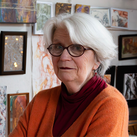 Ihr Atelier ist, wie der Rest der Wohnung, ein lebendiges Museum. Als Tutilo sein Atelier noch nebenan hatte, wirkte der Kontrast fast gestellt: Bei ihr viel Raum und freie Tische; bei ihm ein Chaos, das Abstellflächen gar nicht erahnen lässt, jedoch so präzise gestaltet, dass es schwerfiel, wieder hinauszugehen. Die gebürtige US-Amerikanerin, im Mittleren Westen in eine Kunsthandwerksfamilie hineingeboren, ist 1970 nach Hamburg „ausgerissen“ und studierte Malerei. Den Spuren der Neuen Sachlichkeit folgend, zog sie 1979 bewusst nach Karlsruhe und blieb. Ihr Handwerkszeug ist alles „Learning by Doing“, die Profs an der Akademie hatten anderes zu tun. „Ich wollte lernen, etwas aufs Papier zu bringen.