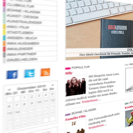 Zudem profitieren Sie von unserem guten Google-Ranking. Eine schnelle Übersicht und Orientierung im Kultur- und Stadtgeschehen bringen die vertrauten Rubriken-Blöcke „Popkultur“, „Clubkultur“, „Bühne/Klassik“, „Kunst/Design“, „Stadtleben“ und „Wissen/Buch“, in die neben den Texten und dem Gesamtterminkalender aus INKA Stadtmagazin und INKA Regio auch brandaktuelle Infos aus der Online-Redaktion einfließen.